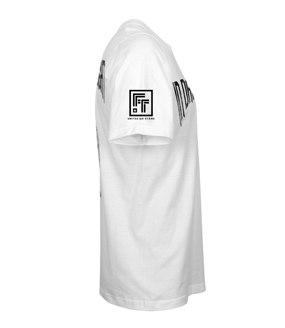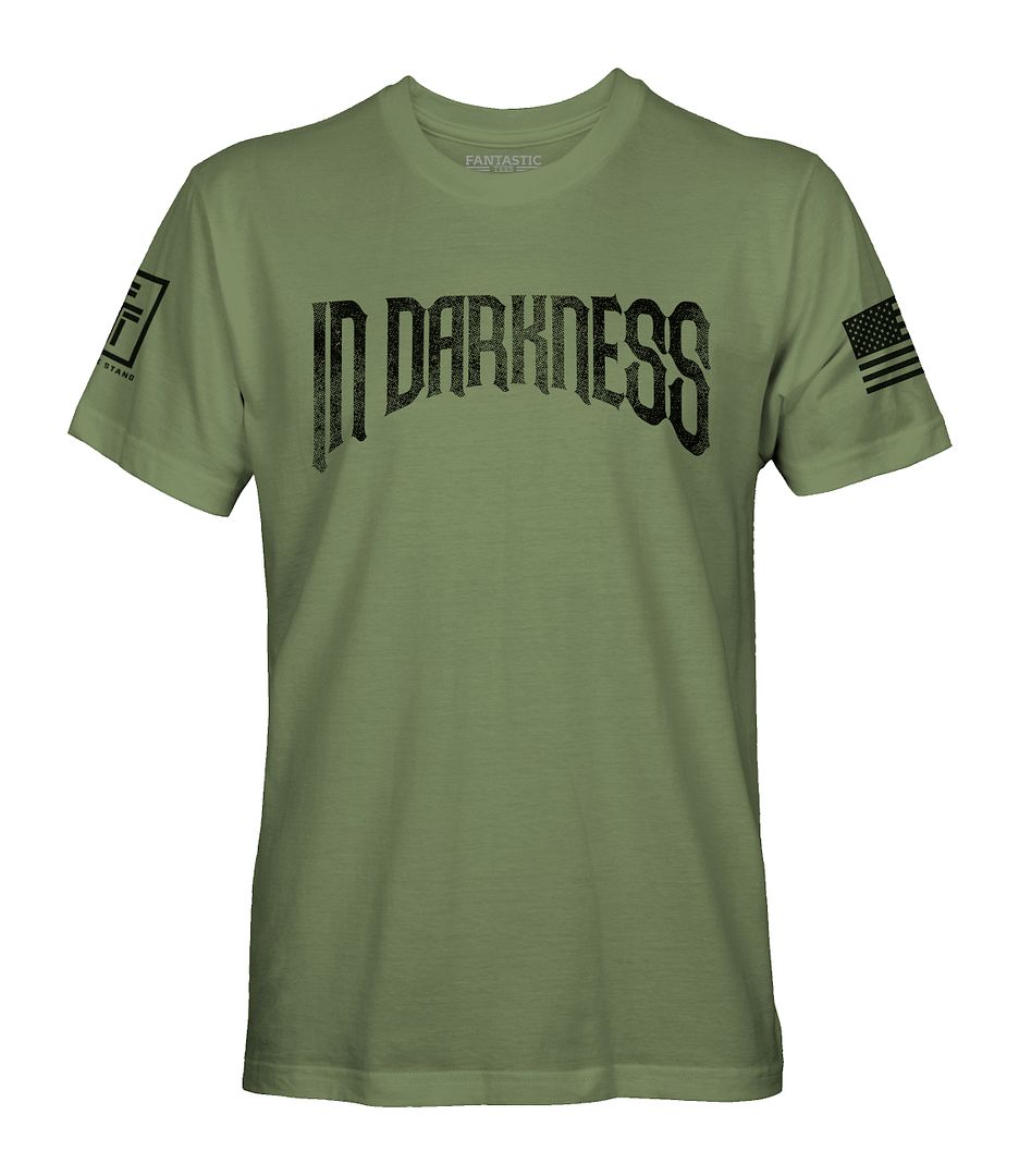 The front displays the phrase “In Darkness”, a striking contrast that speaks to the shadows where true defenders operate. The left sleeve carries the American flag with pride, while the right sleeve is stamped with the Fantastic Tees logo, representing strength, freedom, and purpose.