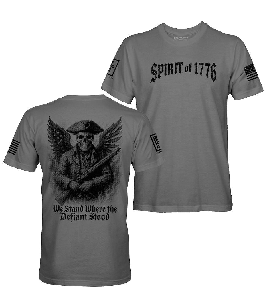 On the front chest, the design features the phrase “Spirit of 1776” a tribute to the year rebellion ignited revolution, now reawakened in the image of the undead patriot.