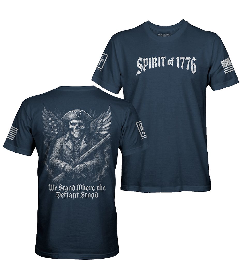 On the front chest, the design features the phrase “Spirit of 1776” a tribute to the year rebellion ignited revolution, now reawakened in the image of the undead patriot.