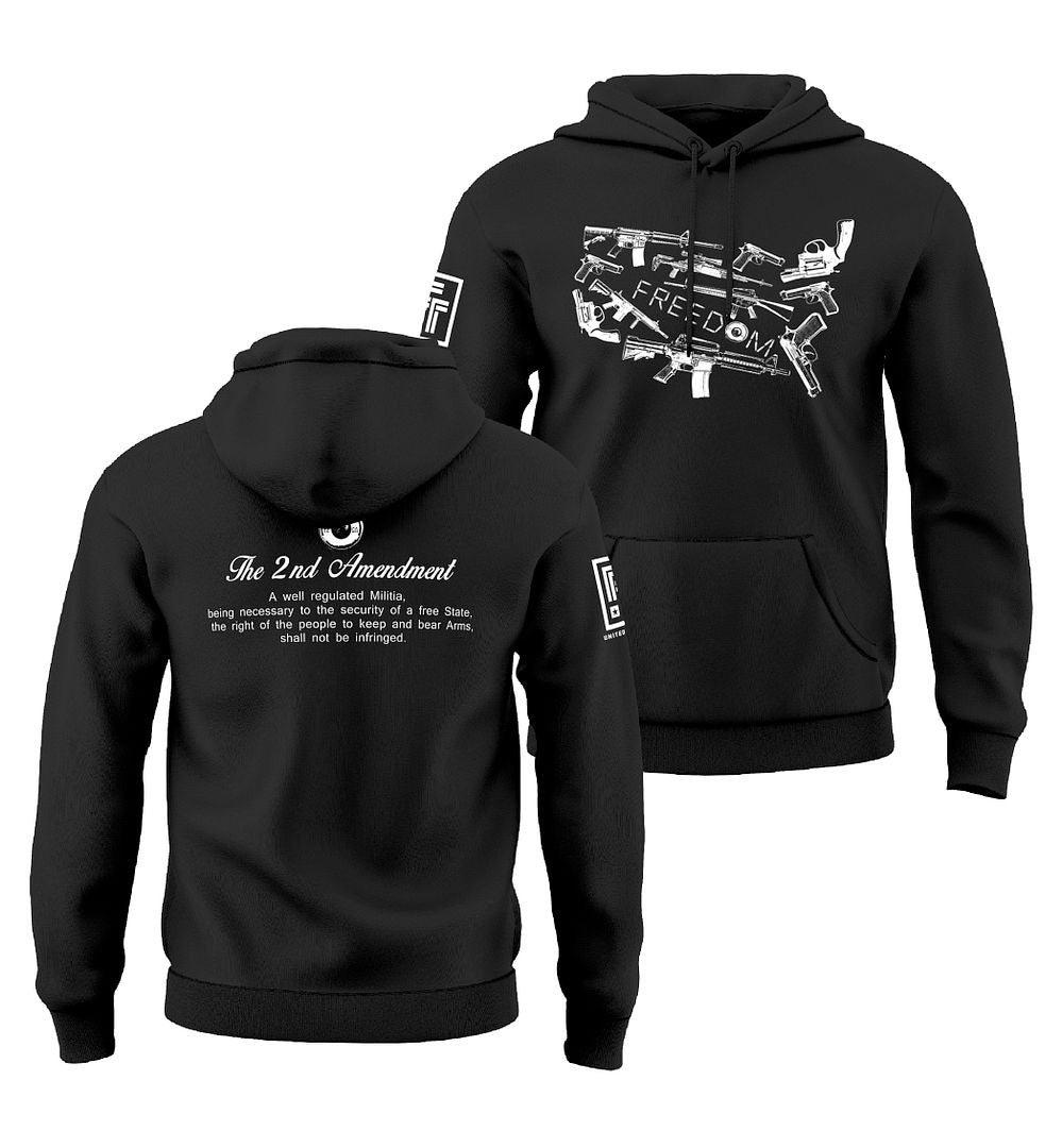 This bold hoodie features a powerful reinterpretation of the USA map—each state replaced with detailed firearm silhouettes, creating a striking tribute to the Second Amendment and the right to bear arms. It’s a visual reminder that freedom is protected by strength.