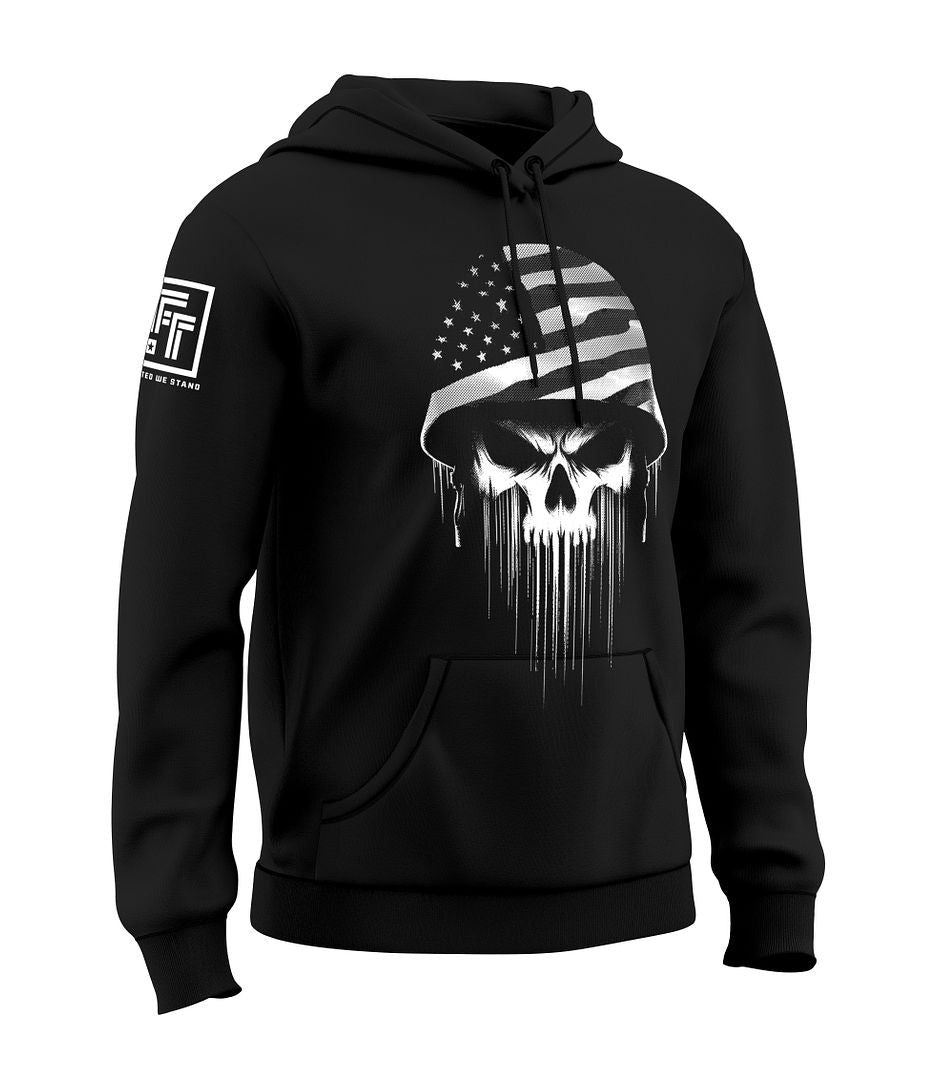 Showcasing a bold tribute to resilience and the warrior spirit, this hoodie features a powerful design—a distressed skull wearing a military helmet that seamlessly forms the American flag. It’s a striking symbol of strength, sacrifice, and unwavering patriotism.